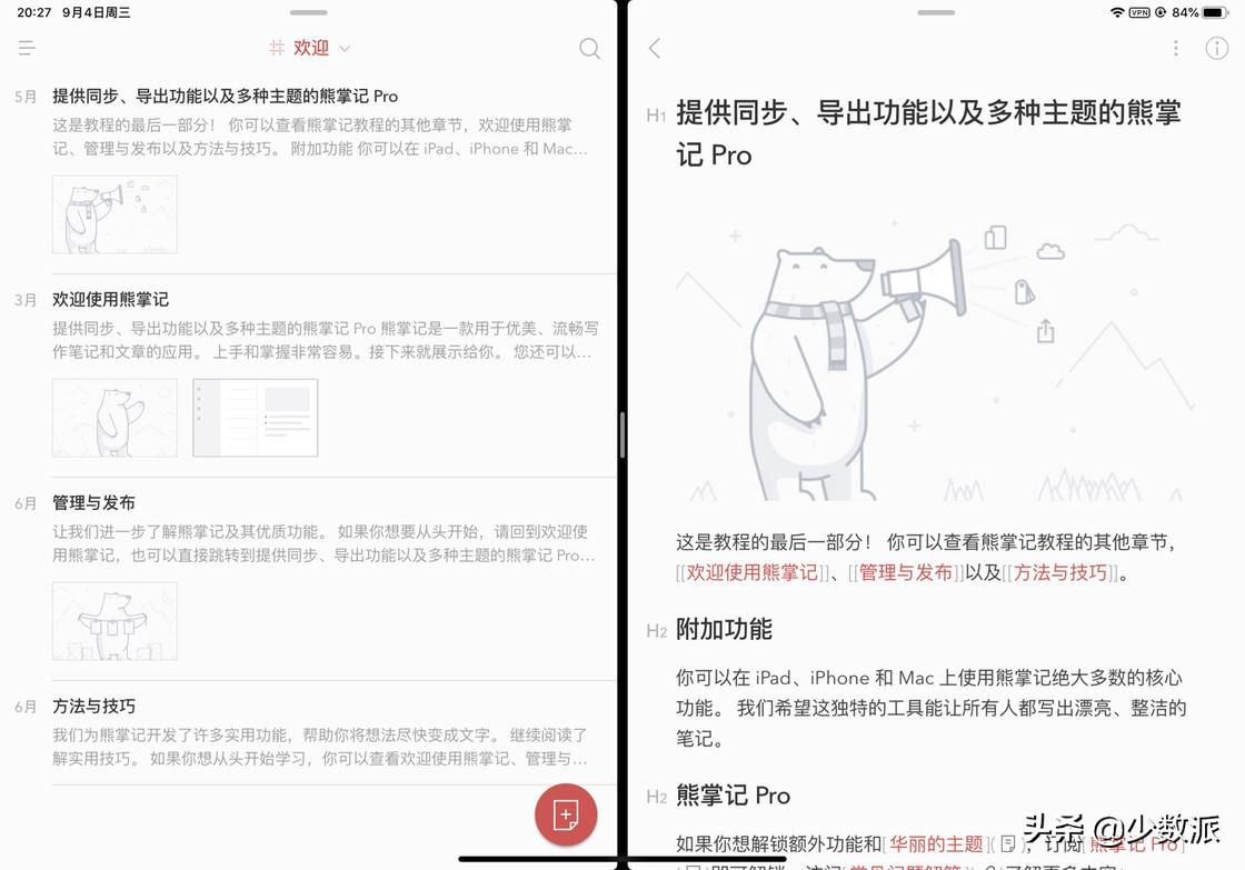 在即将发布的 iPadOS 的中,一个实用功能是「多空间使用」,我们可以将同一个 App 在多个空间窗口中打开。现在熊掌记已经支持了 iPadOS 多空间使用,在主屏幕打开熊掌记后,我们可以呼出 Dock 栏,利用「分屏浏览」就能再打开一个熊掌记窗口,相关功能将在 iPadOS 正式发布后再上线。