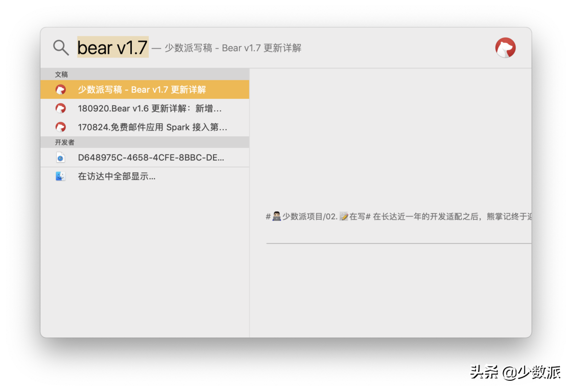 在应用外部,macOS 版熊掌记支持聚焦搜索(Spotlight)了。现在我们可以利用聚焦功能随时搜索到熊掌记的笔记。在 iOS 和 iPadOS 上,聚焦搜索显示熊掌记笔记的结果更加迅速。在应用内部,如果检索文本出现在笔记标题中时,这条笔记在搜索结果中还会优先显示。