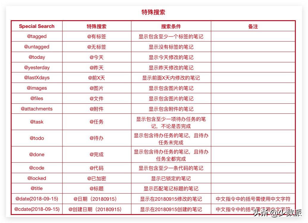 特殊搜索支持中文了,这也是熊掌记的一个高阶用法。在笔记列表的搜索框中,我们可以利用 @有标签、@日期(20180915) 等指令来搜索符合特定条件的笔记。需要注意的是,部分指令中的符号需使用中文字符。