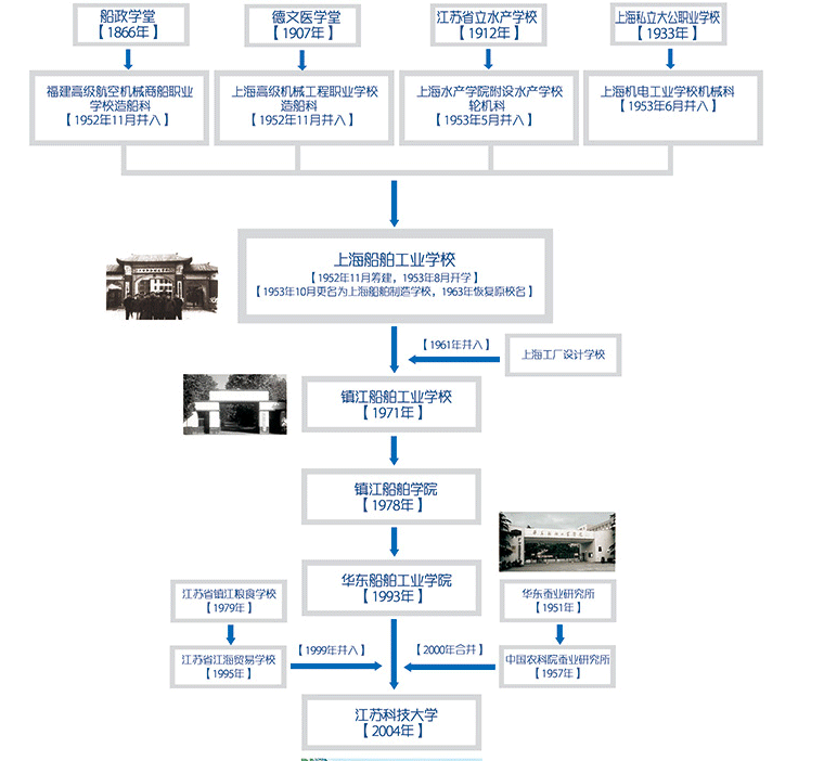 从历史来看,江苏科技大学可追溯的历史,要晚一些:她源自1933年上海大公职业学校,1953年组建上海船舶工业学校——新中国第一所造船中等专业学校,1970年迁至镇江,1971年更名为镇江船舶工业学校,1978年升格为本科并更名为镇江船舶学院,1993年更名为华东船舶工业学院。1999年学校从原中国船舶工业总公司划转江苏省管理。1999年江苏省江海贸易学校并入,2000年中国农科院蚕业研究所与学校合并。2004年学校更名为江苏科技大学。学校1978年开始招收培养本科生,1993年取得硕士学位授予权,2008年取得博士学位授予权。