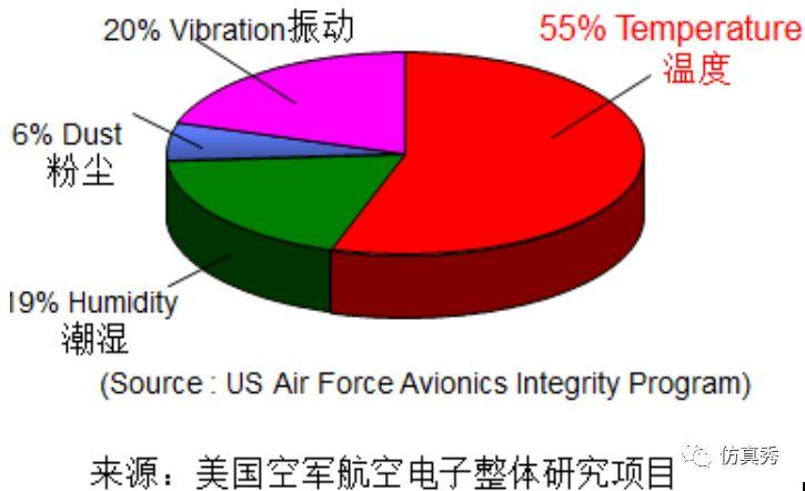 对引起设备失效的各类原因进行统计(资料来源:美国空军航空整体研究项目,US Air ForceAvionics Integrity Program),从中可以看出温度是影响元器件可靠性的主要因素。