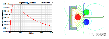 图5展示了使用Maxwell瞬态求解器仿真在雷击瞬间大电流涌入下电缆磁场动态变化过程,动态地再现能量的衰减现象。此强有力的仿真案例:外加激励电压源或者电流源为任意雷击波形(或者使用Maxwell自带的circuit editor外电路编辑器工具),同时考虑铠装材料的非线性,考虑电涡流和磁扩散等。