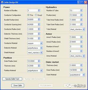 ANSYS提供的基于Maxwell软件的参数化输入“线缆线束设计工具包”, 功率电缆参数化定义界面如图2所示,分别输入功率线、护套、铠装、冷却管等尺寸参数和材料,即可以自动生成如图1所示之几何模型,修改模型参数十分方便,自动实时更新几何尺寸。