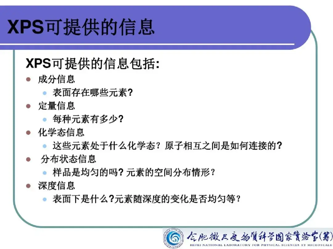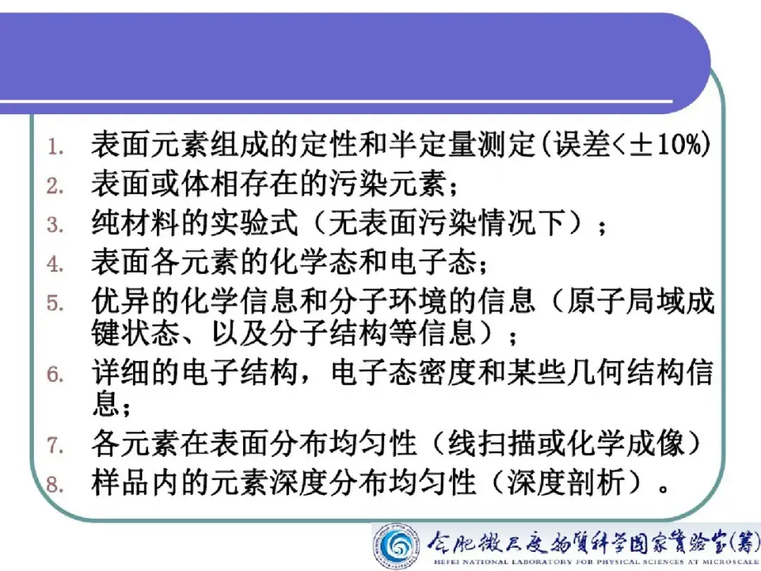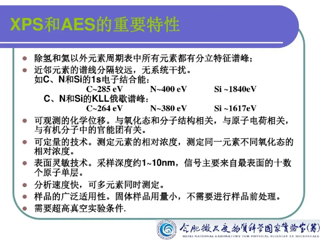 x射线光 电子能谱 分析能得到哪些信息?元素化学态如何鉴别?(1)可以分析除H和He以外的所有元素,对所有元素的灵敏度具有相同的数量级。(2)相邻元素的同种能级的谱线相隔较远,相互干扰较少,元素定性的标识性强。(3...(...