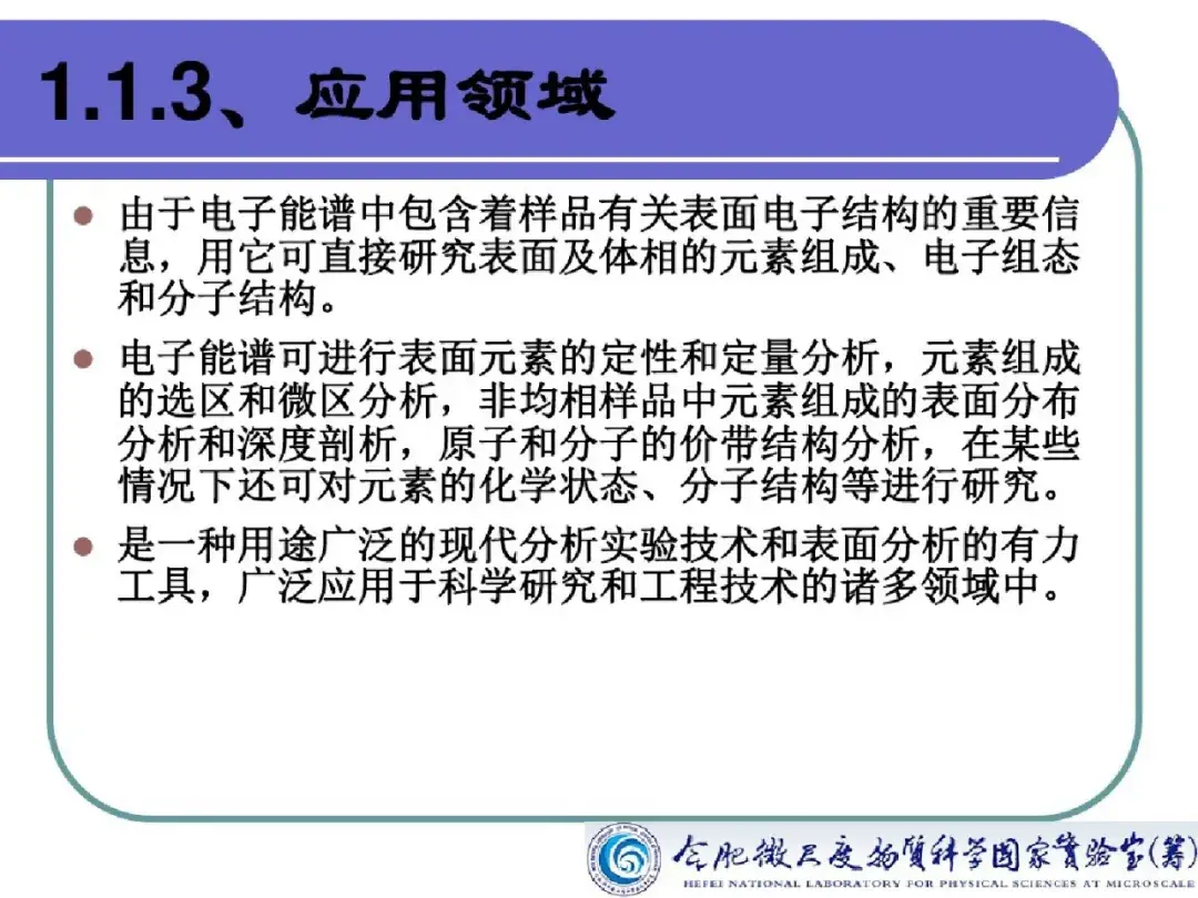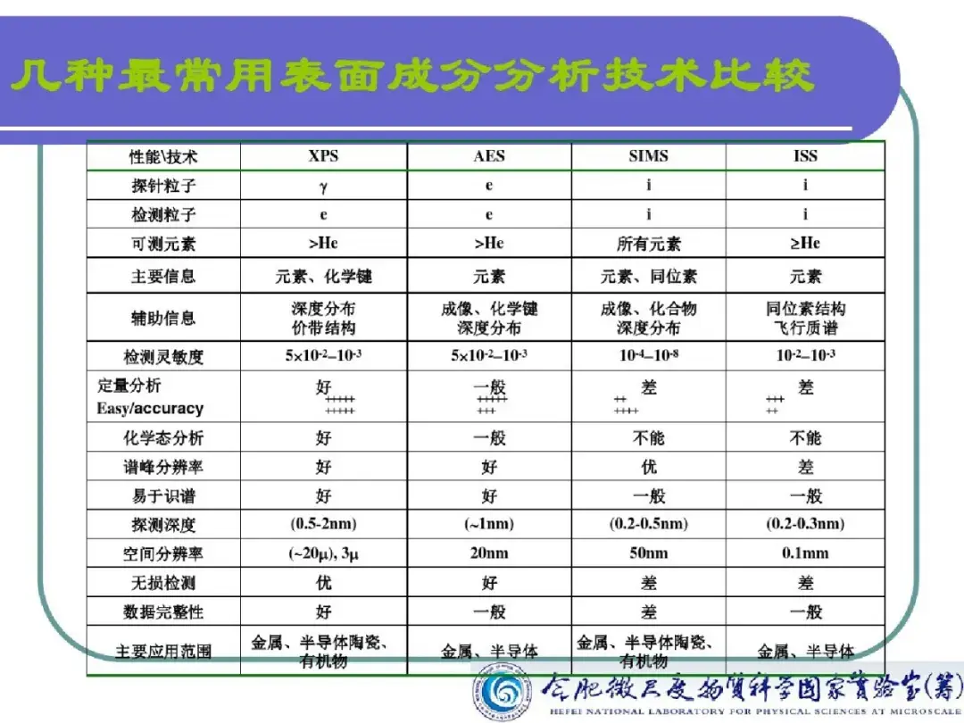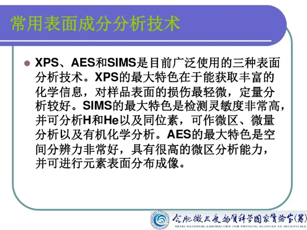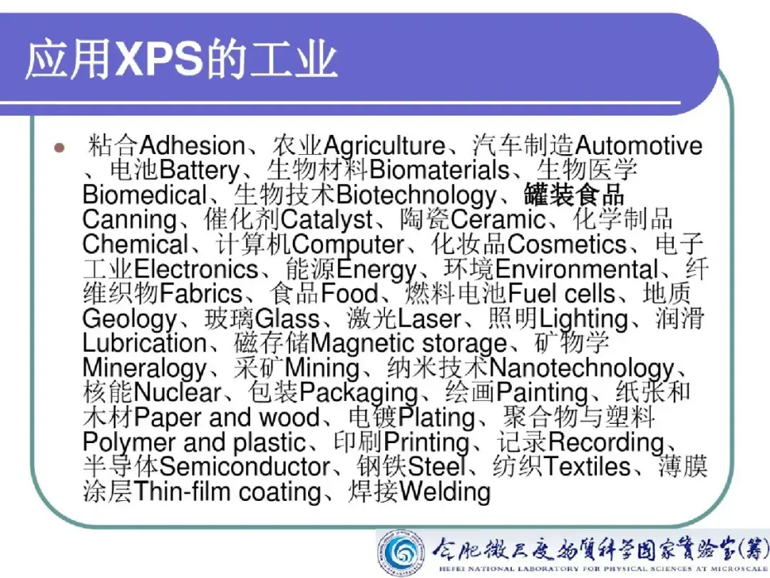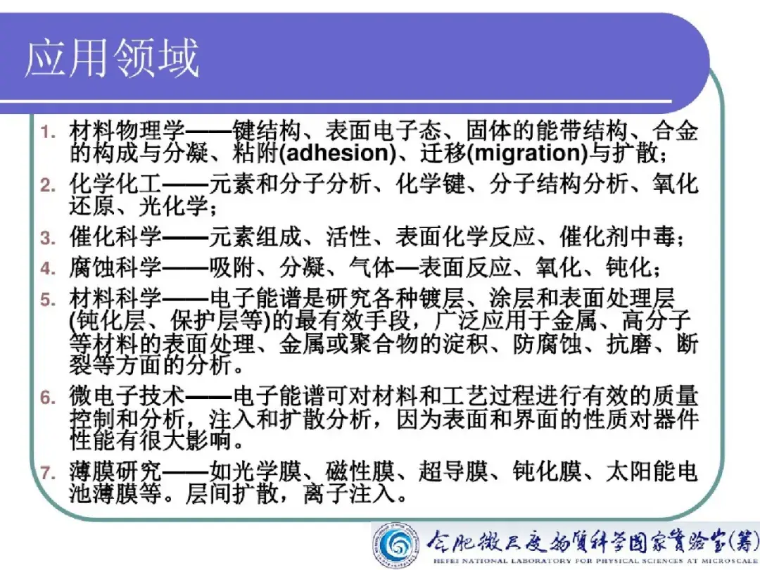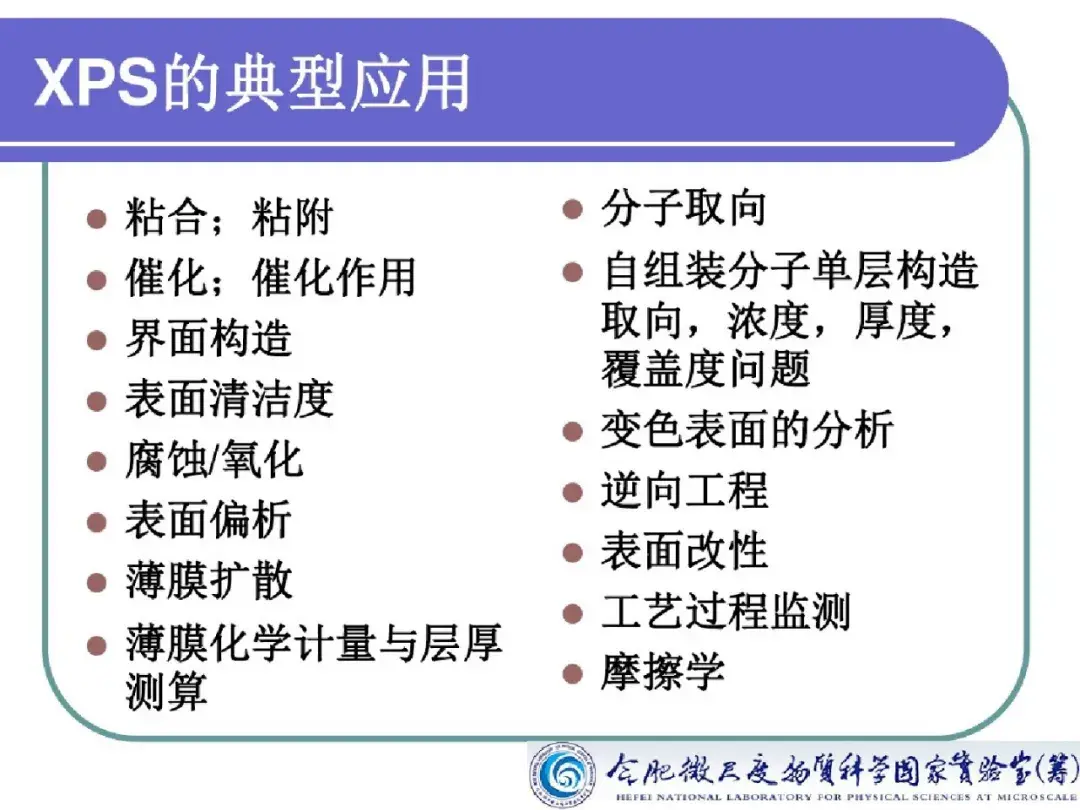 X 射线光电子能谱技术作为一种高灵敏超微量的表面分析技术,对所有元素的灵敏度具有相同的数量级,能够观测化学位移,能够对固体样品的元素成分进行定性、定量或半定量及价态分析,广泛地应用于元素分析、多相研究、化合物结构分析、元素价态分析。此外在对氧化、腐蚀、催化等微观机理研究,污染化学、尘埃粒子研究,界面及过渡层研究等方面均有所应用。