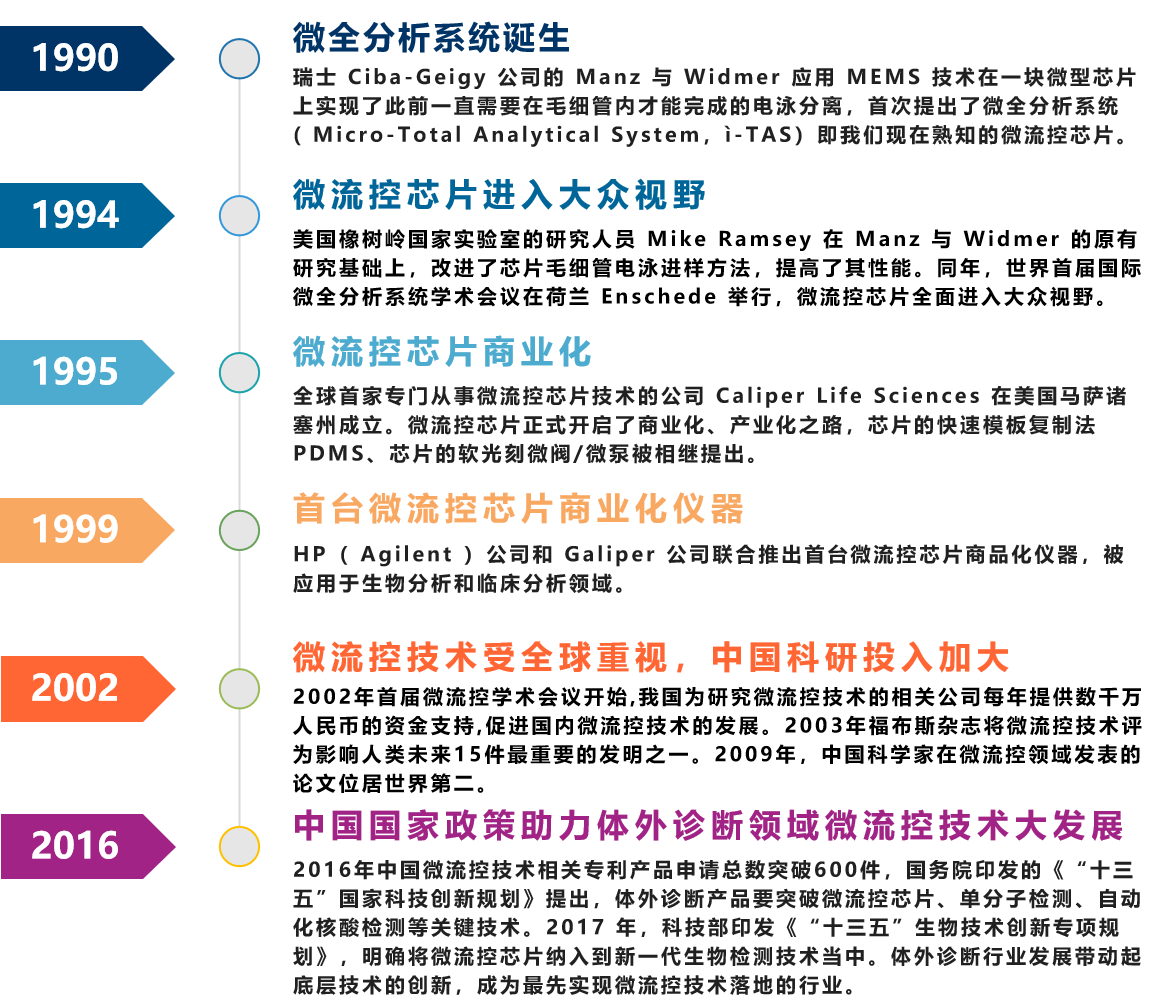 微流控技术的发展历史虽然并不长,却是一个涉及了工程学、 物理学、 化学、 微加工和生物工程等领域的交叉学科。微流控芯片是微流控技术的下游应用单元,是当前微全分析系统领域发展的重点。