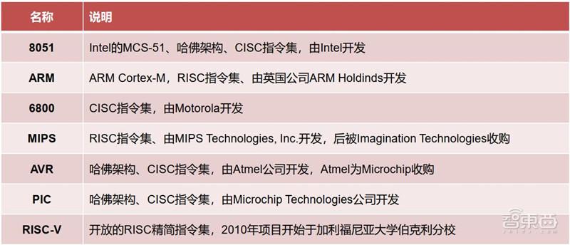 目前市场上主流的MCU中央处理器,包括由Intel开发MCS-51内核、由英国公司ARMHoldinds开发的ARM Cortex-M内核、由Motorola开发的6800内核、由MIPSTechnologies, Inc.开发的MIPS内核、由Atmel公司开发的AVR内核、由MicrochipTechnologies公司开发PIC内核、由加利福尼亚大学伯克利分校开发的RISC-V内核。