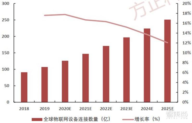 根据GSMA数据,2018年全球物联网设备数量为91亿个,2010-2018年复合增长率为20.9%,预计2025年全球物联网设备将高达252亿个。