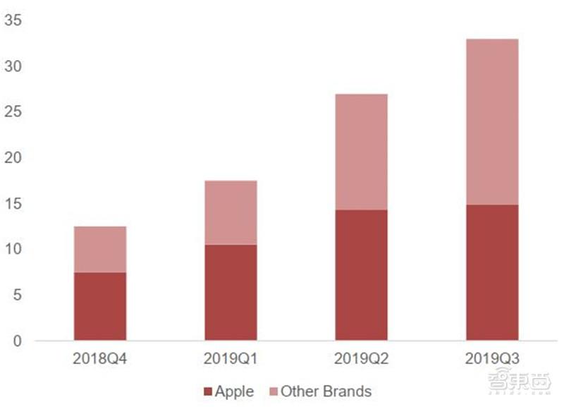 在Air Pods引爆市场后,各手机厂商如华为、OPPO、vivo、小米以及传统音频厂商Sony、BOSE、1MORE、漫步者纷纷跟进推出相关产品,苹果市场份额虽仍是第一,其他品牌耳机也在加速抢占,使得苹果市场份额逐年减少,据Statista数据,苹果TWS耳机市场占有率从2018年Q4的60%下降到2019年Q3的45%。