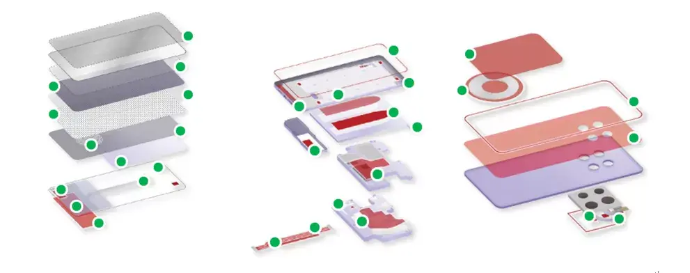 在智能手机的组装中,主要的胶粘应用场景有镜片保护膜、镜片粘接、指纹模组粘接、FPC粘接、摄像头粘接、OLED/LCD粘接、电池粘接、石墨片/NFC/无线充电模组粘接、后盖(电池盖)粘接、后盖装饰件粘接等。
