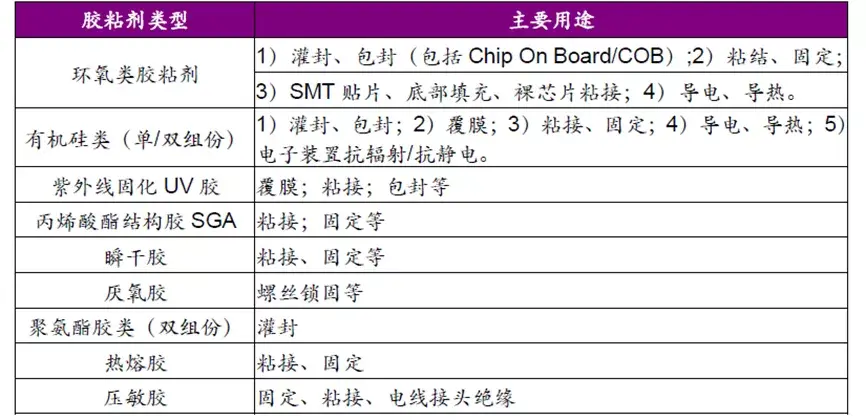 那么具体在5G消费电子领域有哪些胶粘剂类型呢,我们一起来看看: