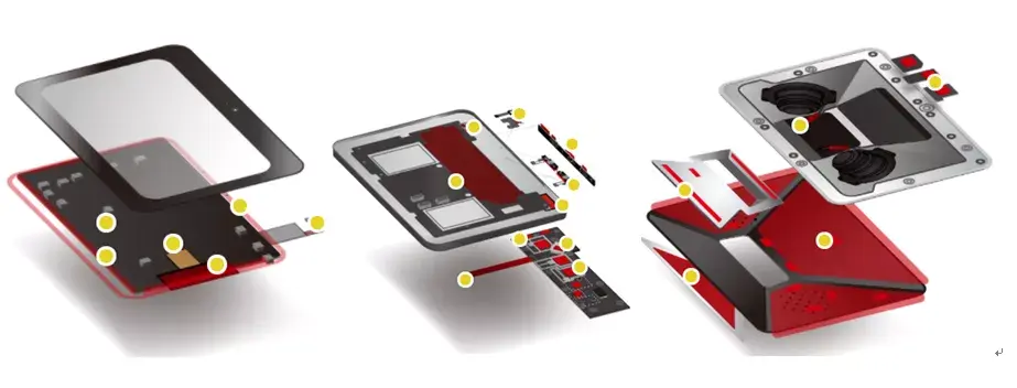 在笔记本电脑的组装中,主要的胶粘应用场景有相机模块屏蔽、屏幕粘接、屏幕缓冲泡面粘接、框架粘接、显示模组接地、面板遮光屏蔽、前框黏贴、装饰面板粘接、模组接地、模组粘接、键盘接地、键盘线路板粘接、导热垫片/凝胶、泡棉粘接、风扇接地、后盖接地、防尘网粘接、后盖粘接等。