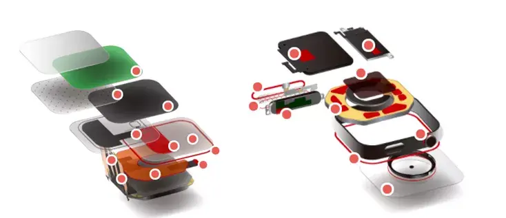 在智能手表的组装中,主要的胶粘应用场景有OLED制程保护膜排气、石墨片粘接、柔板粘接、前屏粘接、柔板粘接、电池粘接、扬声器粘接、网纱粘接、磁铁粘接、泡棉粘接、旋钮粘接、后盖粘接、后盖玻璃粘接等。