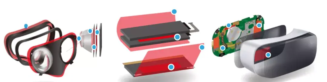 在AR/VR设备的组装中,主要的胶粘应用场景有织布与塑料件粘接、透镜片和塑料套筒粘接、OLED显示模组和塑料套筒粘接、石墨片和OLED粘接、塑料壳泡棉粘接、软包电池间粘接、电池模组麦拉粘接、软包电池和金属盒粘接、左右FPC天线和塑料支架粘结等。