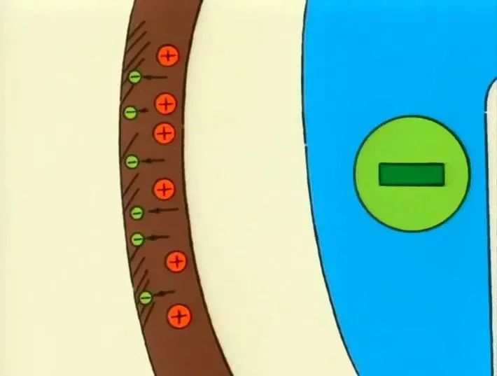 片子通过形象的动画来向孩子讲解质子带正电,中子不带电,电子带负电,于是有了静电现象。