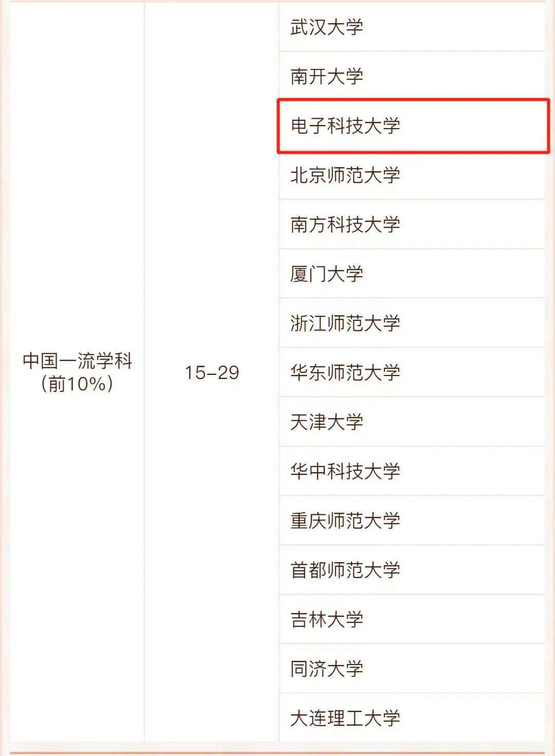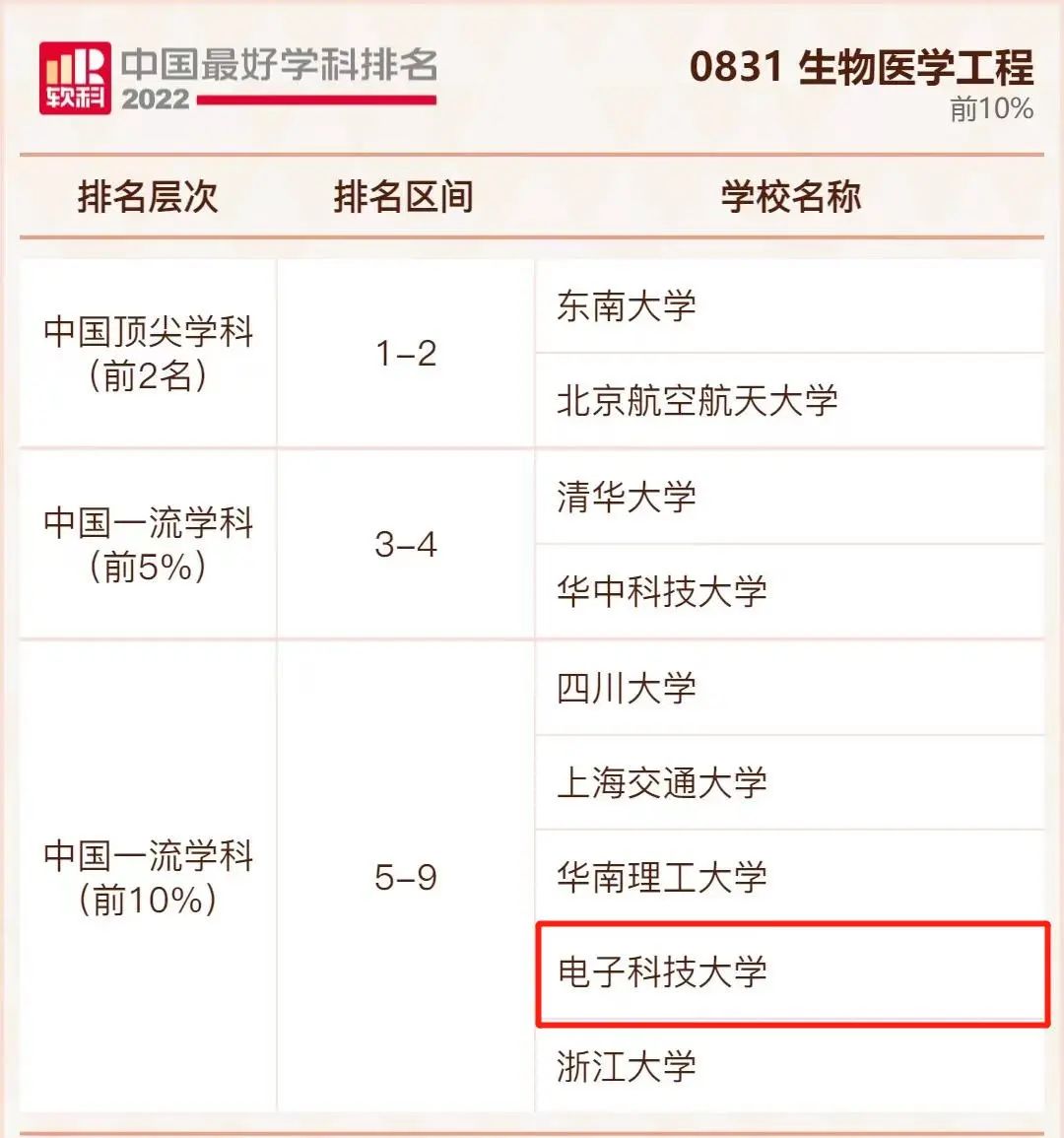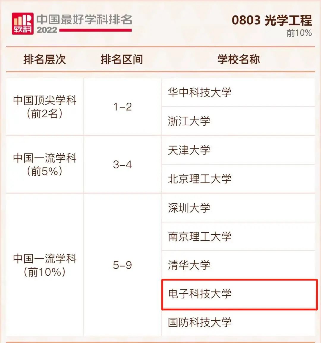 光学工程学科排名共有49所大学上榜,电子科技大学位列前10% 。