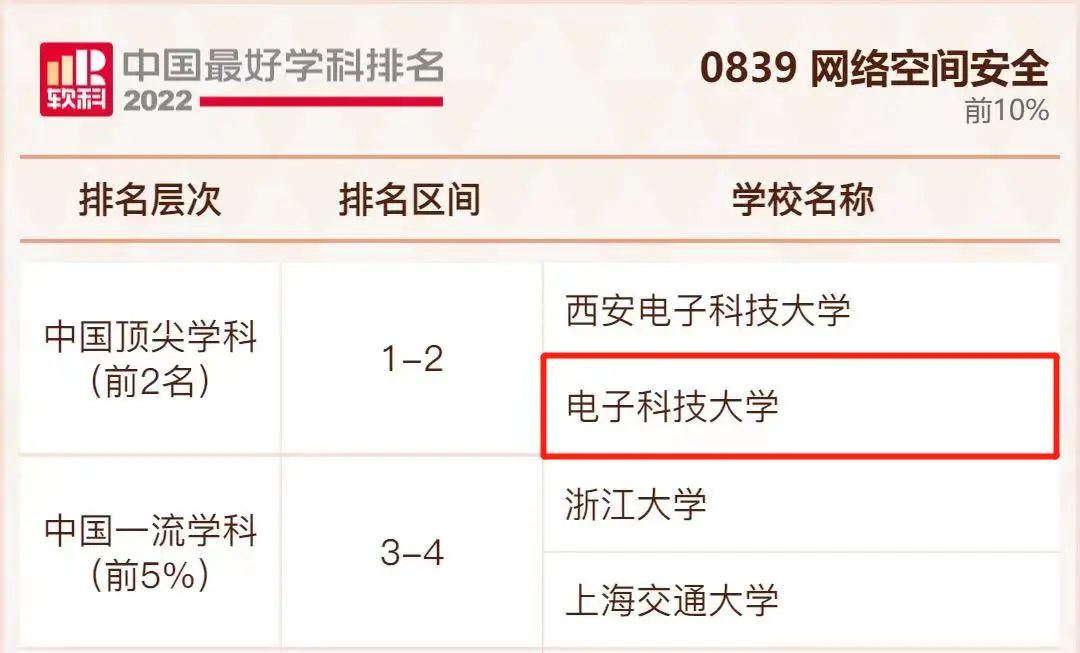 网络空间安全学科排名共有41所大学上榜,电子科技大学位列前2名 。
