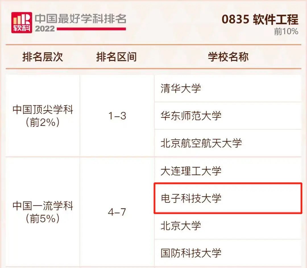 软件工程学科排名共有79所大学上榜,电子科技大学位列前5% 。