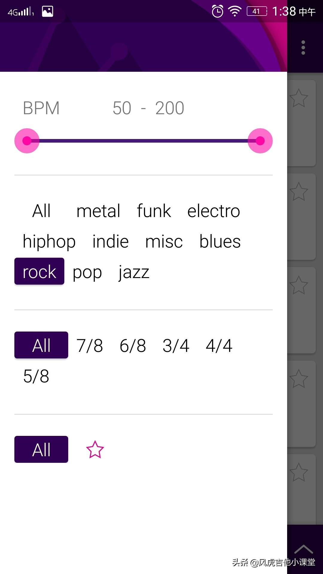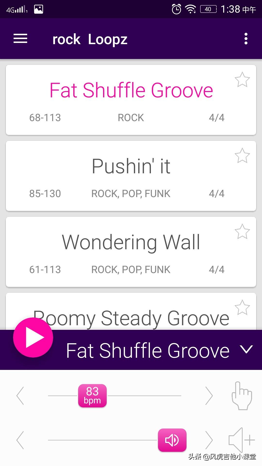 今天给各位琴友介绍一款鼓Loop的安卓软件Loopz,这一款鼓loop软件非常棒,里面的风格几乎应有尽有,从metal,funk,electro,hiphop,indie,misc,blues,rock,pop,jazz,大部分常用的风格鼓节奏几乎都包括在里面了,而且里面也有一些不是很常用的拍数,比如,7/8,5/8等等,真的非常实用。这一款软件的使用非常简单,太特么容易上手了,点击左上角,选择速度,风格类型,和拍数,然后,把选择菜单从右往左移开,就在风格目录里挑一种你喜欢的,就OK啦。操作真的很简单,使用很方便,我自己感觉真的非常爽。我截取了几张图,大家可以看一下: