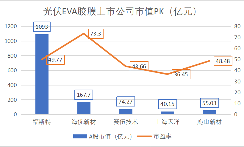 截至4月1日,“光伏胶膜龙头”福斯特市值已超千亿,包括鹿山新材在内的其余4家上市公司市值在40亿元至170亿元之间,与福斯特相比相差甚远。