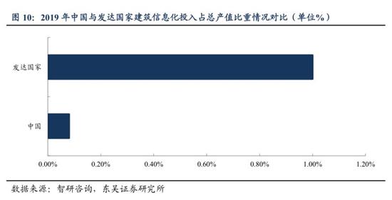 智研咨询发布的《2019-2025年中国建筑工程行业市场调研及投资方向研究报告》表示,2019年,相比于发达国家,中国的建筑信息化水平还十分落后。我国建筑施工企业信息化投入占总产值的比例约为 0.08%,而发达国家则为1%,中国仅约为发达国家的 1/10,仍有较大提升空间。