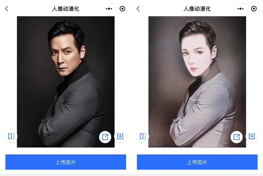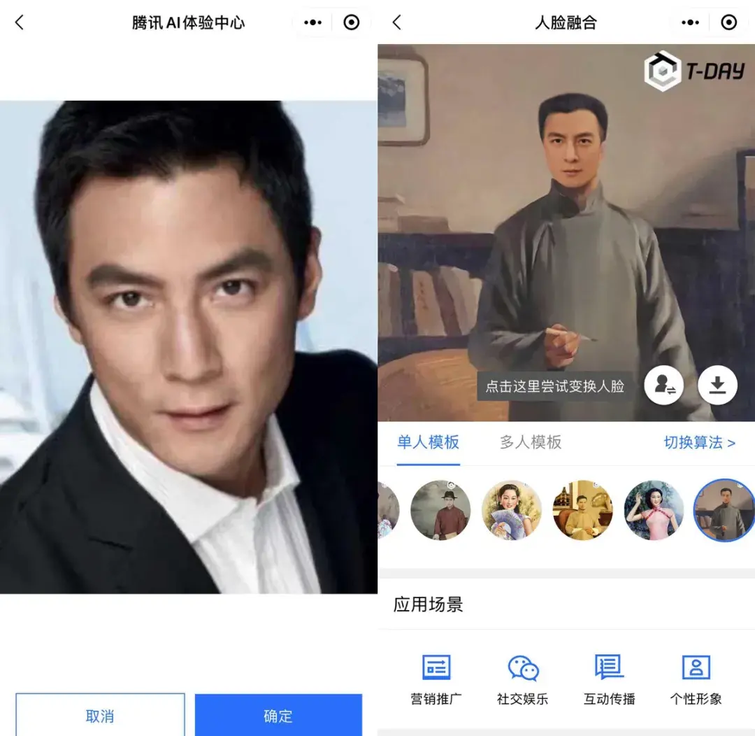 机哥给大家演示一下人脸融合,选择模板之后,就可以通过拍照或上传照片的形式,把自己的五官融合到模板的人物上。