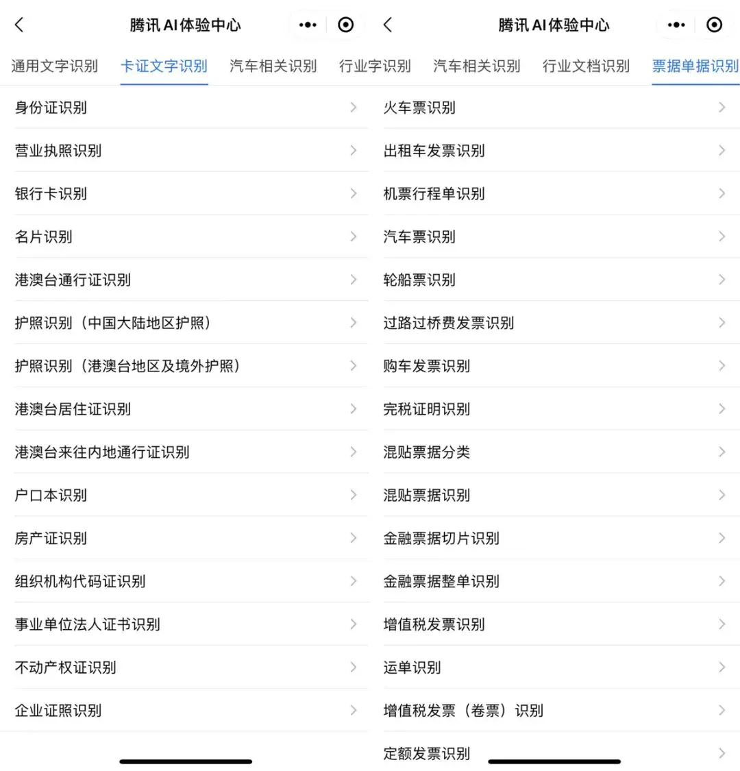 例如文字识别功能,就能识别多种场景的问题,包括印刷/手写字体、证件、行业文档和票据。