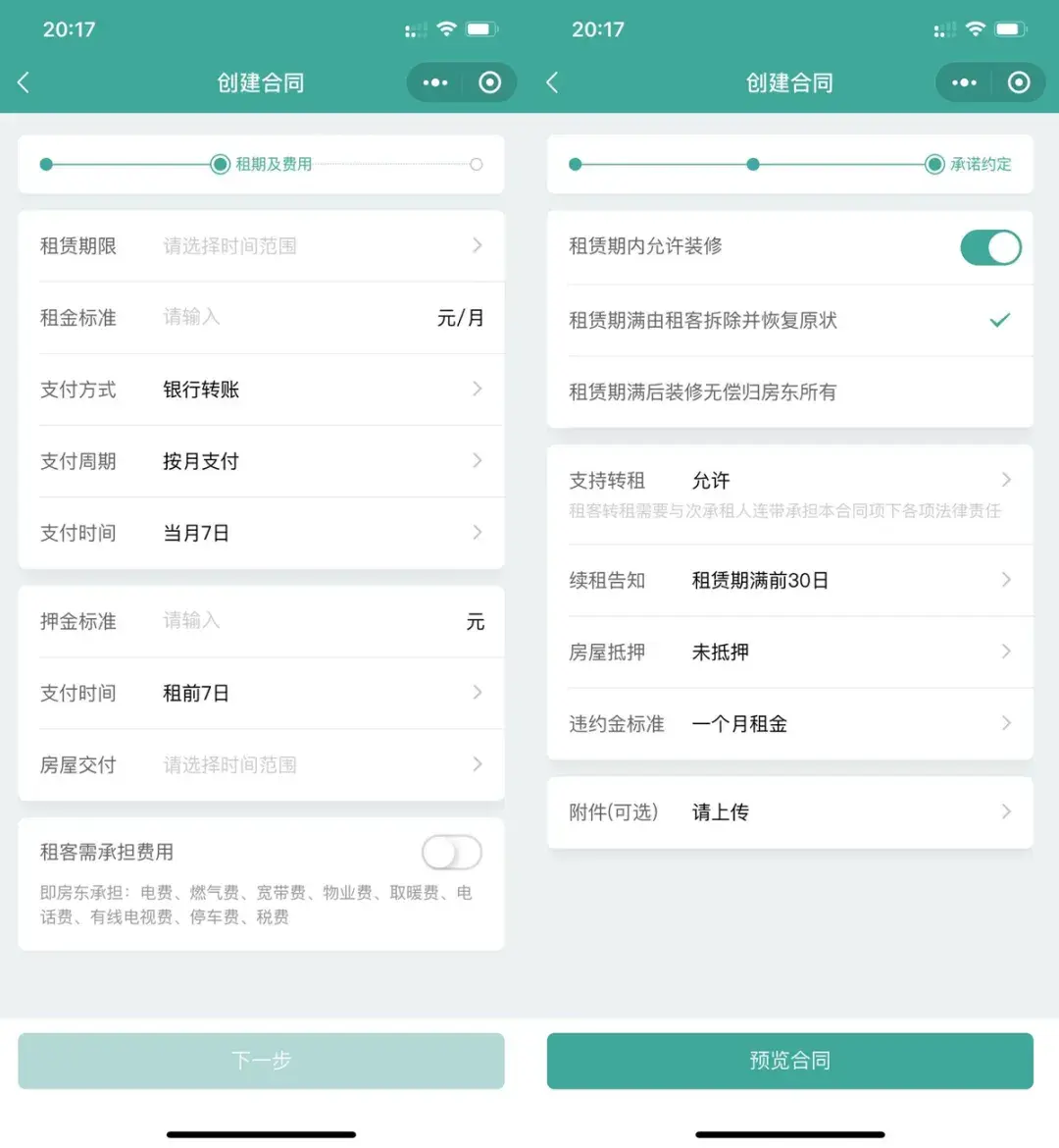 就连水电煤气费的承担方、租期内是否可以装修/转租等问题,在这里都能够进行设置,避免将来扯皮。