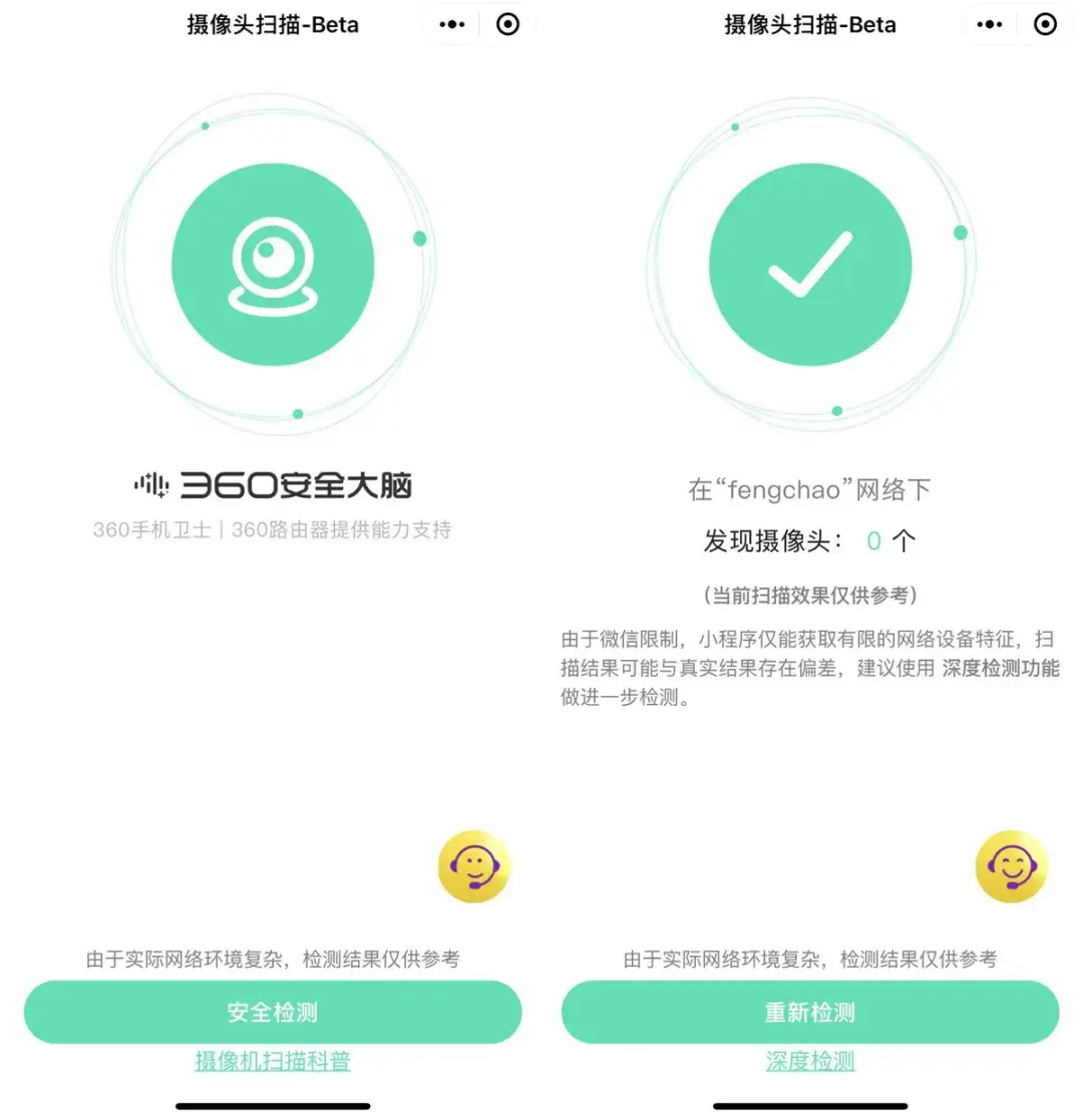 只要打开这个「摄像头扫描」小程序,你就可以选择「安全监测」,扫描摄像头。