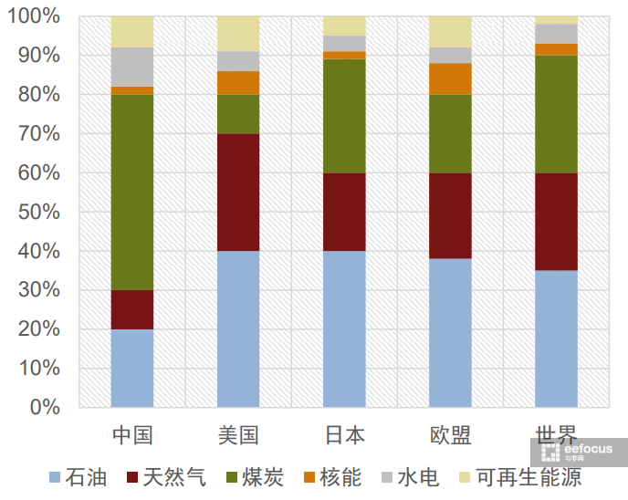 我们先来看一组来自IEA的数据,这是2018年各国一次能源需求结构的对比情况。2018年我国能源供应结构中原煤占比61.9%,原油占比19.1%,天然气占比7.2%,而可实现碳零排放的清洁能源,如水能、核能、太阳能、风能等,占比仅为 11.8%。