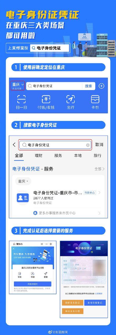 【太方便了!重庆率先实现电子身份凭证多场景落地】继出门不用带钱包之后,今后重庆人出门也不用带身份证了!据了解,目前重庆在支付宝上线的“警快办”小程序,支持电子身份证等多种便民服务,目前,重庆超3万门店可用电子身份凭证全市18862家酒店旅馆、2100多家网吧、42家移动自营厅,5100多家移动加盟和代理已成功实现应用。