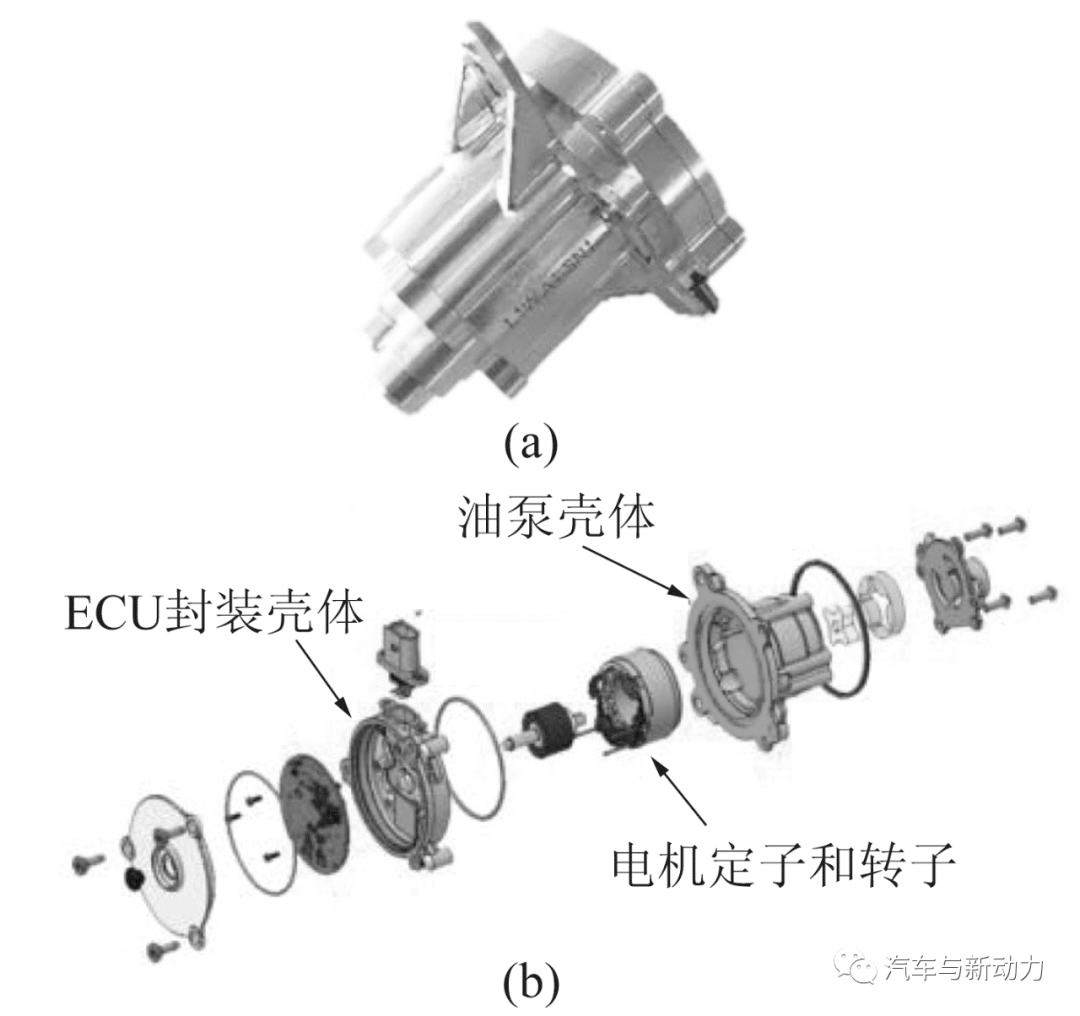 图1 带有集成ECU和电子机油泵的爆炸图(具有内部油道外壳和ECU封装腔)