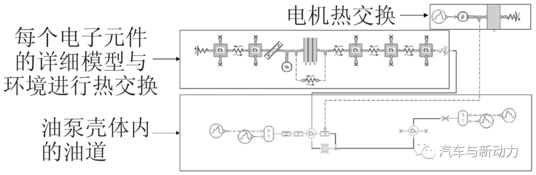 电子机油泵的一维仿真模型如图4所示。基于此模型,研究人员进行了更精确的研究。为了保护电子元件,ECU切换到低性能模式,这意味着通过软件降低了电气系统功率,从而降低了电子元件的热量,防止电子元件过热。油泵开始降低性能时的温度与不同的冷却系统密切相关。通过热力学模拟,研究人员比较了如下2种不同的冷却系统:(1)油冷式,有内部机油再循环,无外部空气对流;(2)风冷式,无内部机油再循环,有外部空气对流。