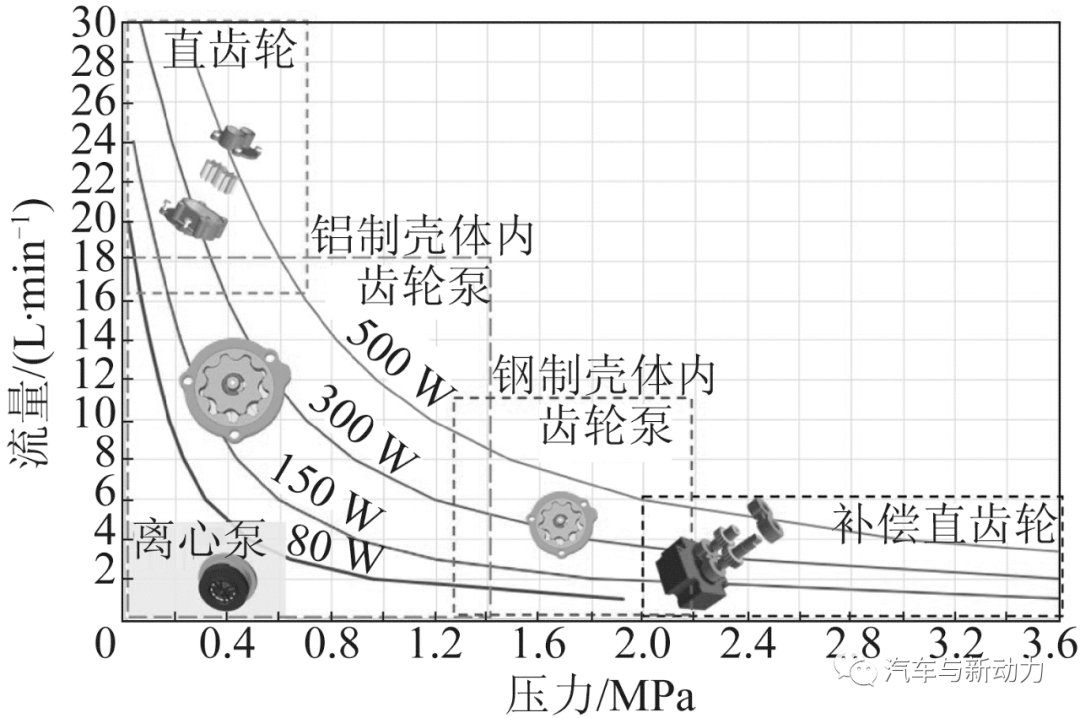 图10汇总了不同机油泵的应用案例。图11对不同机油泵类型的功率和机油流量重合区域进行了分析。由图11可知,在等功率线上,有多种不同的机油泵元件方案可供选择。值得关注的是,采用离心叶轮泵可以与干式电机相结合,但不能在寒冷条件下的恶劣工况点使用。改变电机金属板长度,会使得机油泵的功率发生变化,在图11中表现为从1条等功率线迁移到另1条等功率线。