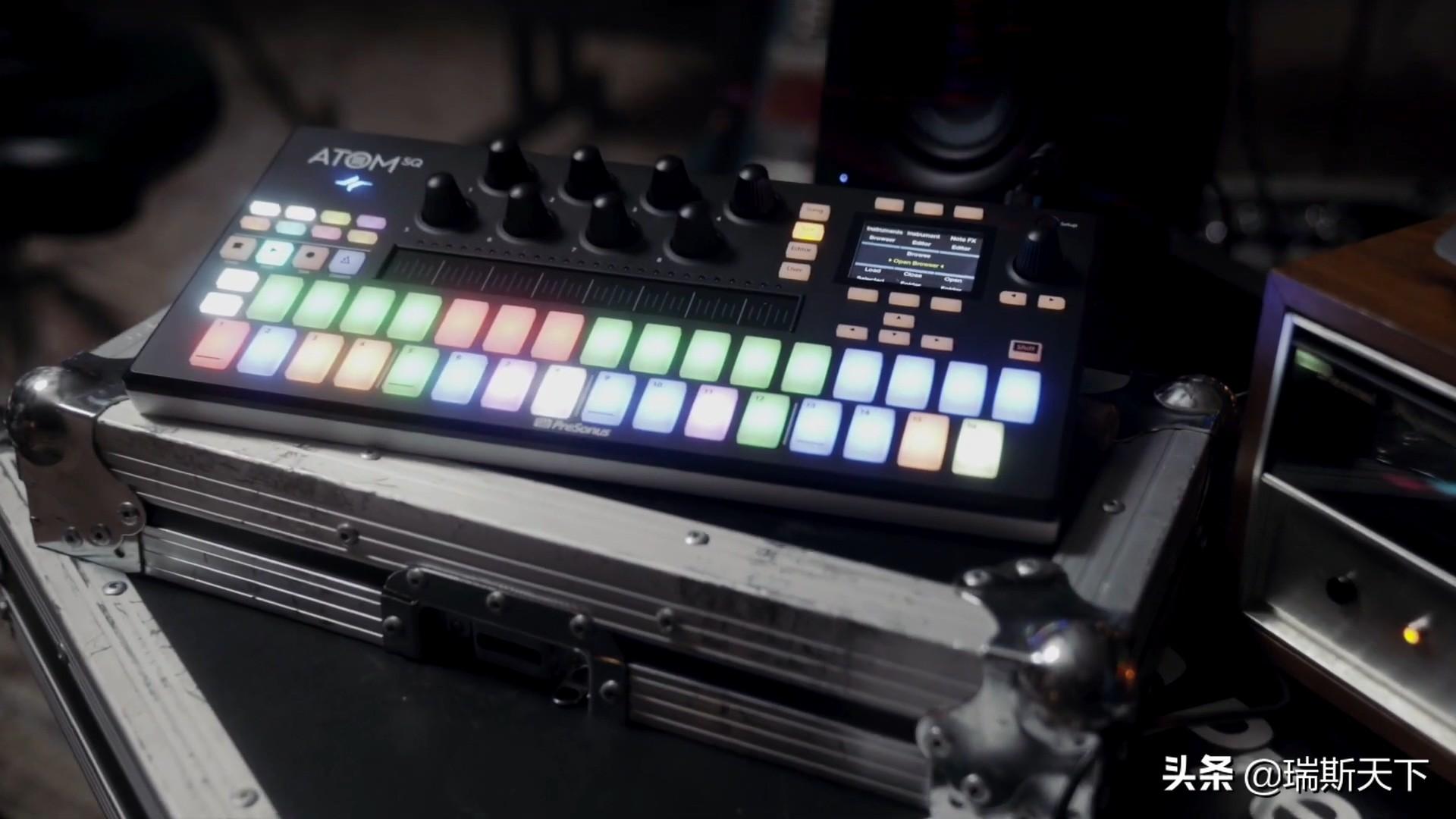 首先从外观上来看 ATOM SQ 音序器,与同类的产品区别不大,上方是显示屏,简单设置一下,然后就能看到很齐全的控制信息,可编程的旋钮通过学习,就可以操控音源上面的各个模块,走带控制方面的,大家都很熟悉了,脱离鼠标键盘操作就是最舒服的,紧接着中间部分,内置了一个触控板,可以作为滤波器使用,这个功能一般在软件比较常见。在新版的ATOM上能看见它,真的是特别新鲜也很好用。有了它的加入,声音就可以更精确的把控。