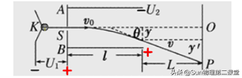 在示波管模型中,粒子经加速电场U1加速,再经偏转电场U2偏转后,需要再经历一段匀速直线运动才会打到荧光屏上而显示亮点P。假设电场右侧离屏的距离为L,则最终亮点P偏离荧光屏中心O的距离为