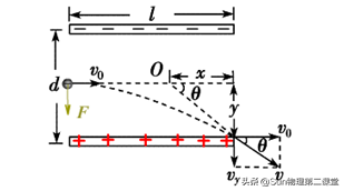 【问题】 如图所示,在真空中有一对平行金属板,板长为l,间距为d,两板间的电势差为U。若一个质量为m,带电量为q的负粒子,以速度v0垂直电场方向射入板间。求粒子射出电场时偏移的距离y和偏角θ(用正切值表示)。