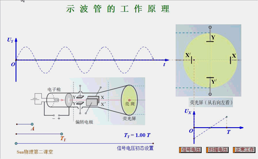 电子束在YY′方向的偏移情况随信号电压的变化而变化,XX′方向的扫描电压控制电子束周期性的从左向右匀速移动。如果信号电压是周期性的,并且扫描电压与信号电压的周期相同,那么,就可以在荧光屏上得到待测信号在一个周期内随时间变化的稳定图像。