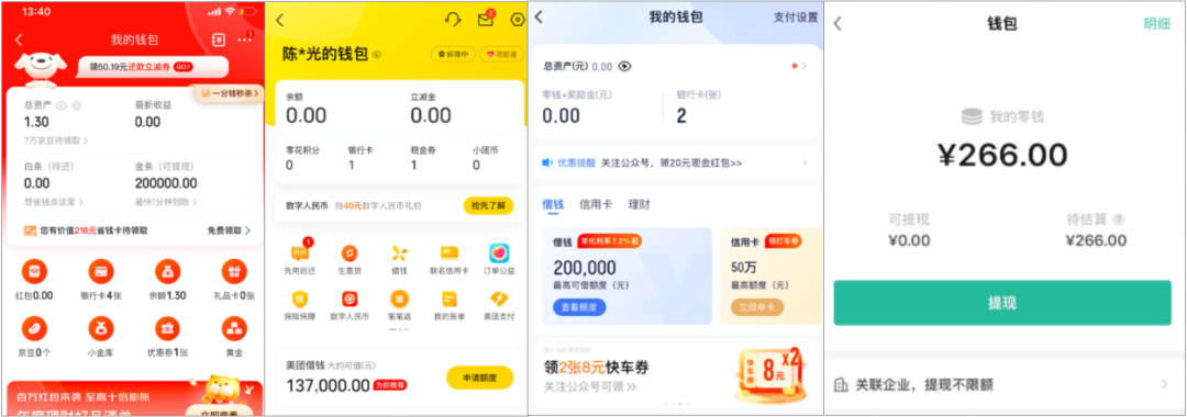 我们看几个钱包示例:京东钱包、美团钱包、滴滴钱包、知识星球钱包。