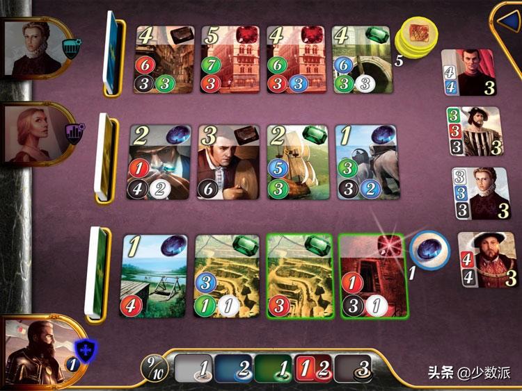 游戏的关键是要制定自己的拿分策略,避免与其他玩家「撞车」选择同样类型的宝石。当然你也可以选择拿别人需要的宝石,通过「卡」其他玩家的方式来获胜。游戏的节奏非常快,半个小时就能结束一局,非常适合排队等桌的时候快速开一局。