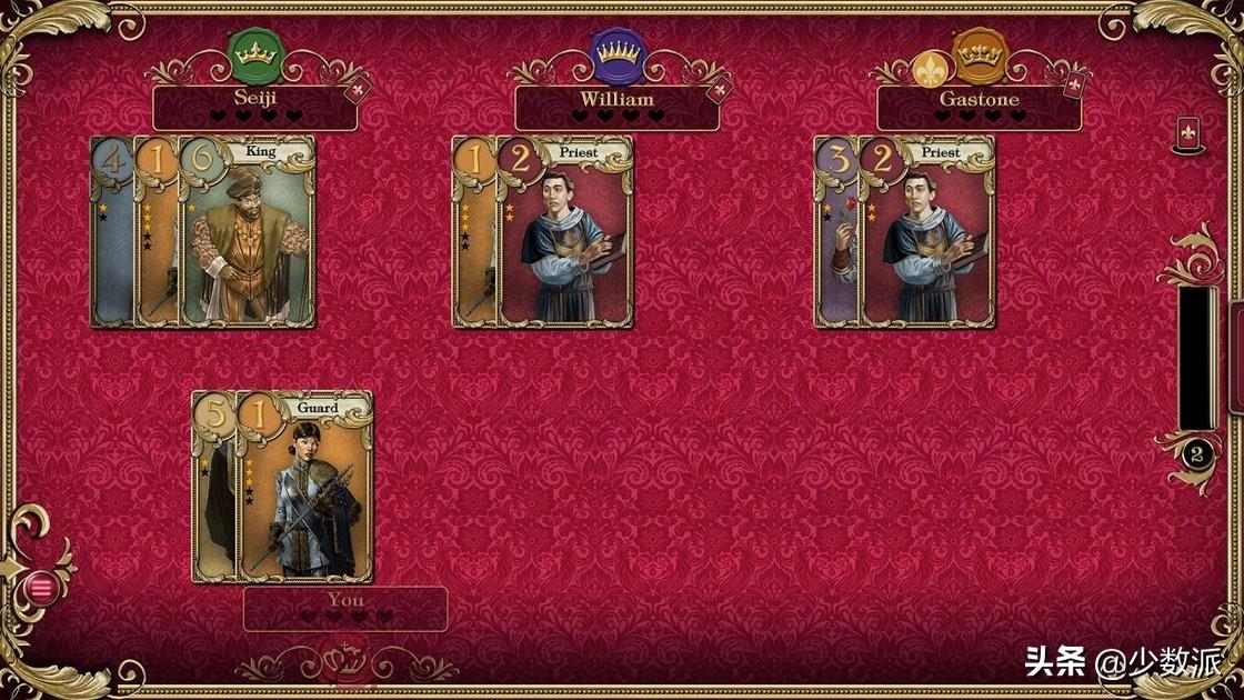 游戏的规则很简单,核心的玩法其实就是比用卡牌比大小,一些角色卡牌上拥有一些特殊效果,并且每种卡牌都有固定的个数。游戏的制胜秘诀就是想办法猜测对手手里的卡牌,再根据情况制定相应的策略,可以说是非常有心机的一款小游戏了。