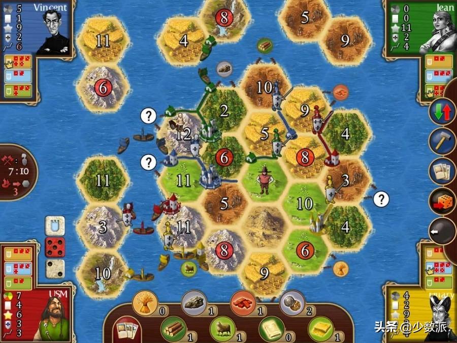 游戏相较于卡卡颂要更具有策略性一些,玩家每回合掷骰子获取资源,然后通过交易与其他玩家交换资源,在地图上修建村庄和道路赢得分数,最终第一个获得 10 分的玩家获胜。与卡卡颂相比,卡坦岛更看重玩家之间的互动,交易和买卖让玩家有了更多的选择,游戏过程里会经常出现各种「嘴炮」的情况,大家游戏里的气氛也非常活跃,很适合几个好友下午聚在一起玩一盘。