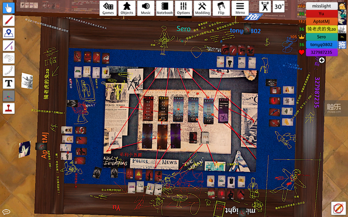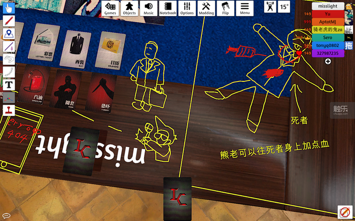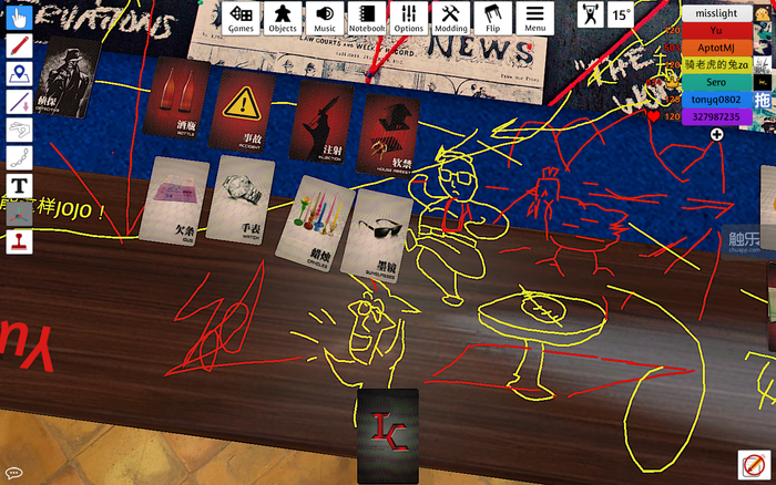 实际上,《桌游模拟器》版本还能体验到一些线下版没有的乐趣,比如“掀桌”——当然这个功能还是不要随便用。又如“涂鸦”,事实证明,只要有了这个功能,人们永远会手欠,把所有可见的平面都变成画板——牛旭老师就是个好例子,大家刚抽完卡,他就忙不迭地在桌面上给每个人画出了形象(而且还很神似!)。