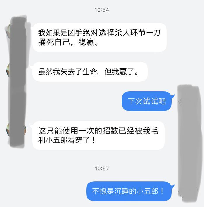 而我这个“凶手”的日子也像《名侦探柯南》中的琴酒一样不好过。身边全是侦探,只有唯一一个小弟伏特加(帮凶),KP虽然给力,但一个不小心就成了卧底——随着第二轮结尾KP(我们的前同事忘川老师)一个口误,我的身份被真正的“柯南”池骋老师彻底拆穿,侦探大胜利,我也只能像所有的凶手一样,投案认输。
