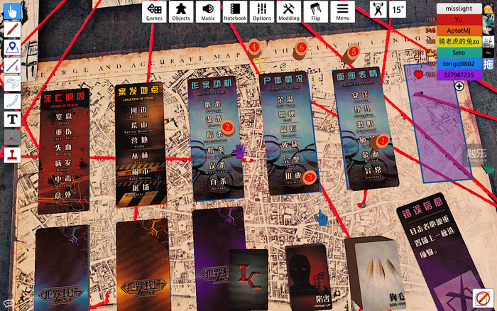 我曾经在线下玩过一次《犯罪现场》,扮演的是侦探。当时这个游戏给我留下了非常好的印象——当侦探实在是太爽了,看着凶手留下的线索,推理过程简直犹如刀切黄油、流水素面一般顺畅!于是,当触乐几位老师提出共同体验桌游模拟器,并把《犯罪现场》作为第一个游戏时,我是非常支持的。