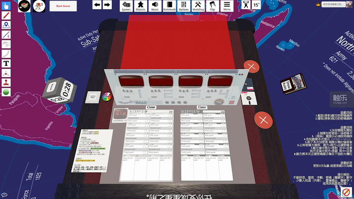 《桌游模拟器》上的《截码战》可能更类似于第一种。首先,由于线上的条件不允许“悄悄话”,两队成员只能进入两个语音频道进行讨论,而在发言者讲述的时候又要跳到同一个频道中。这也导致了两方选手之间无法听到对方细微的讨论(当然也看不到表情),而这些场外因素是《截码战》变得相对柔软的重要方式。
