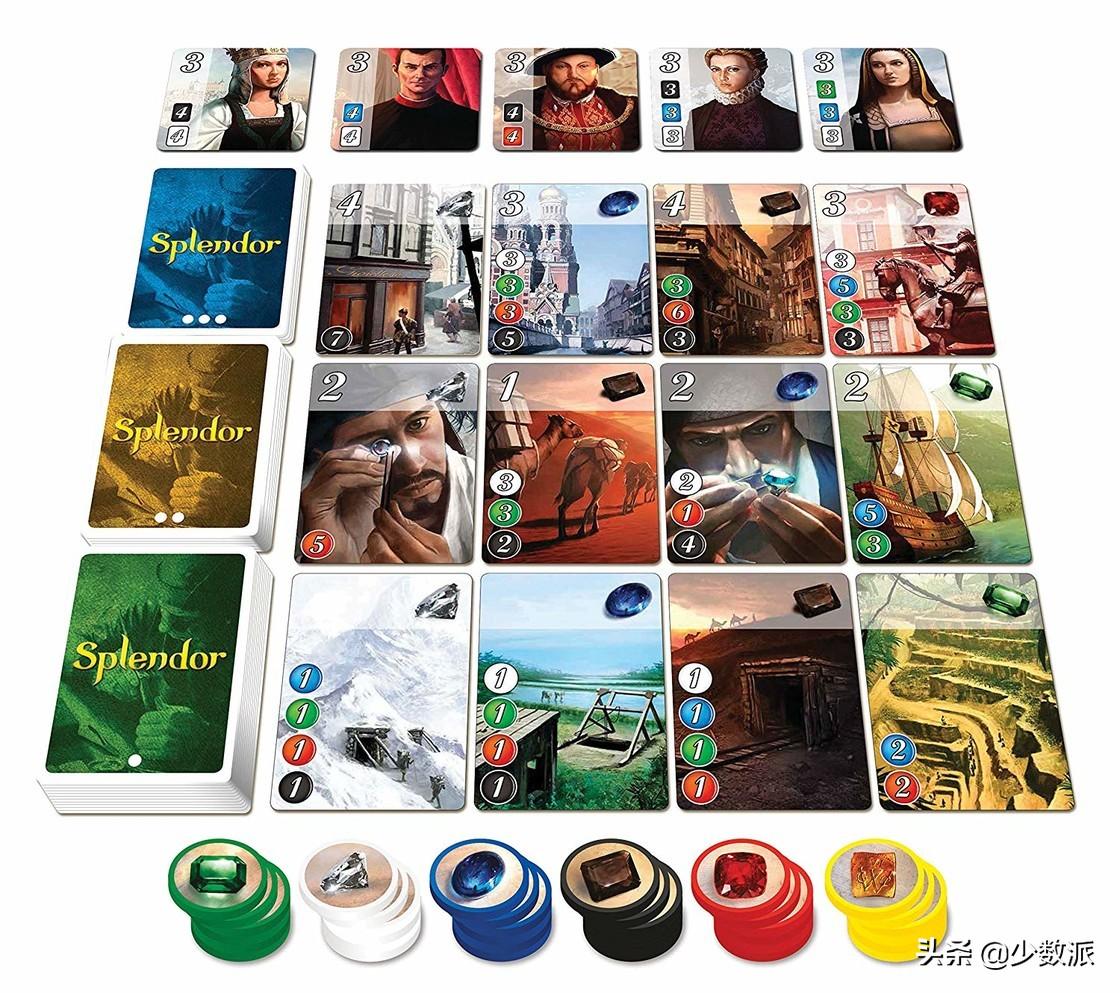 游戏人数:1-4游戏时间:30 分鐘游戏难度:两颗星与卡坦岛和车票之旅类似,璀璨宝石也同样是一款「刷分」游戏。玩家在游戏中扮演文艺复兴时期的宝石商人,通过制作各种精美的宝石,吸引贵族到访,率先获得 15 分的玩家获胜。