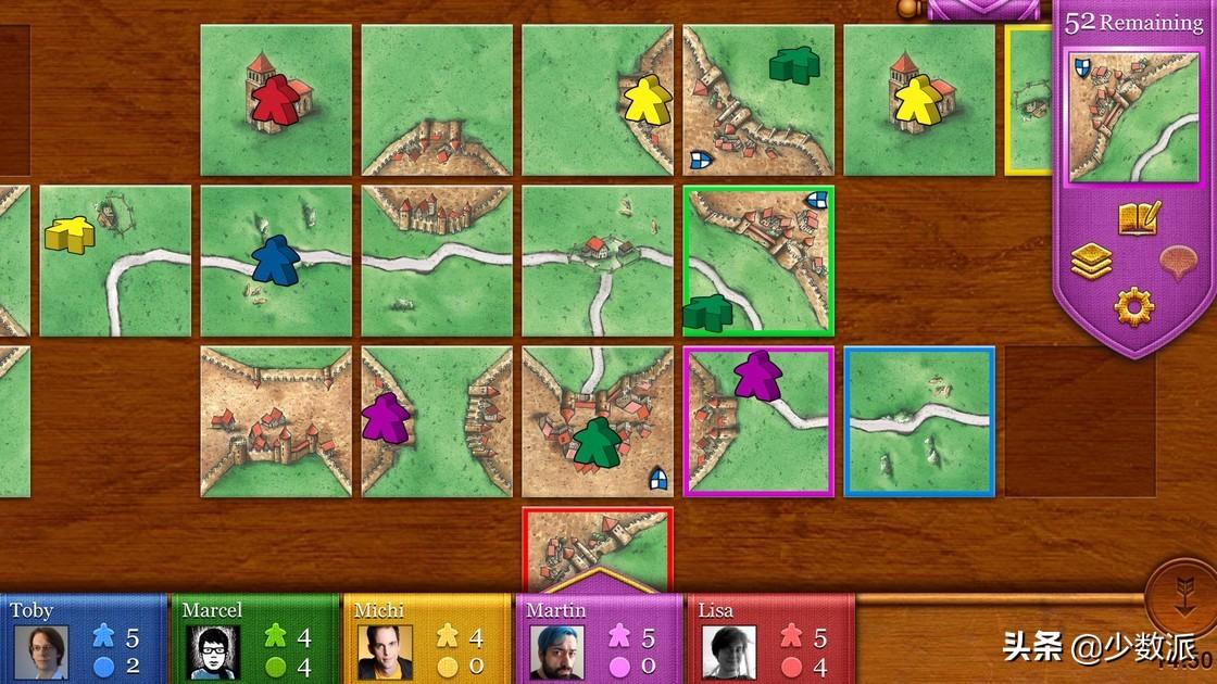 游戏的流程也非常简单,玩家轮流放置板块,然后派出象征部下的「米宝」小人,通过完成拼图来获得分数。数字版的卡卡颂很好地解决了算分这个新手难题,让你可以充分沉浸在游戏当中。游戏除了支持本地多人游戏,还可以进行网络对战,这样你和小伙伴就可以各自拿着设备一起玩了。
