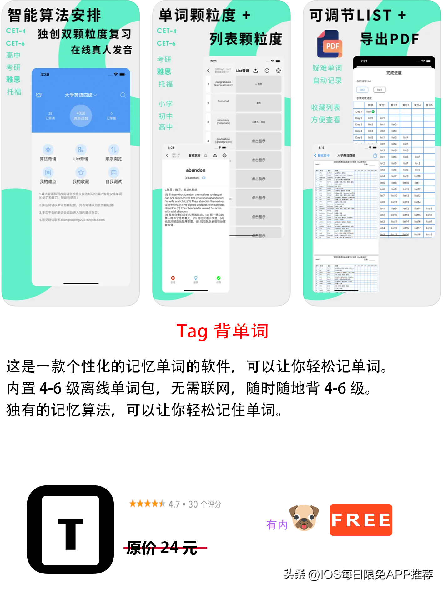 下载链接:https://apps.apple.com/cn/app/tag背单词-cet4-6级必过/id1584529187