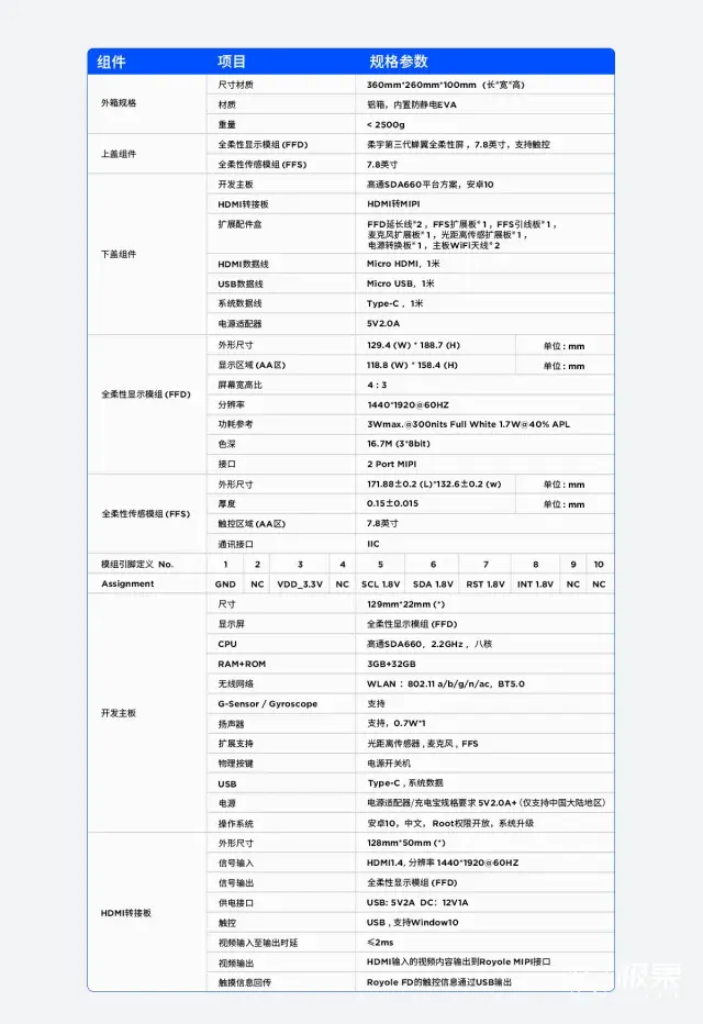 RoKit主要包括4个主要组件,一个主板(包含一块8核、2.2GHz的骁龙SDA660SoC处理器,以及3GB闪存和32GB内存,支持运行Android10)、一个7.8英寸全柔性屏显示屏幕模组、一个全柔性触控传感器模组和一个HDMI适配器。